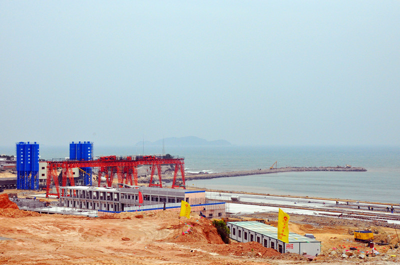 東防波堤工程全長5423米,西防波堤工程全長3315米,口門寬度600米?陂T堤頭段采用直立式沉箱結構,其他堤身段采用拋石斜坡堤結構,共需拋填各類石料1060萬m3,澆筑混凝土82.6萬 m3,項目總投資為25.45億元,建安費17.94億元。東西防波堤建成后,形成港池面積6平方公里,岸線10850米,可建3-30萬噸級泊位30-35個,設計吞吐量2億噸。
