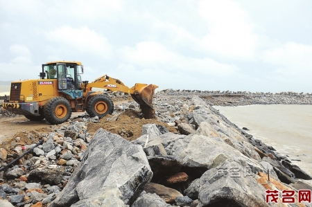 茂名港博賀新港區(qū)東、西防波堤是我市重點工程,是茂名濱海新區(qū)建設深水良港的核心工程。受“彩虹”襲擊前,東防波堤已推填至2210米,西防波堤也已推填至650米。10月4日,受“彩虹”吹襲,東、西防波堤附近海域風速達14-15級,陣風風速最高時達54米每秒(16級)。在大風吹襲及巨浪沖擊下,東防波堤被巨浪打掉約400米,西防波堤被打掉約210米;兩堤堤身受到不同程度破壞;西防波堤預制場三臺龍門吊門機被吹倒,三個砂石料棚被掀翻。雖然遭受強臺風沖擊受損嚴重,但工程防臺工作實現(xiàn)了人員零傷亡,可移動的機械全部安全無損。