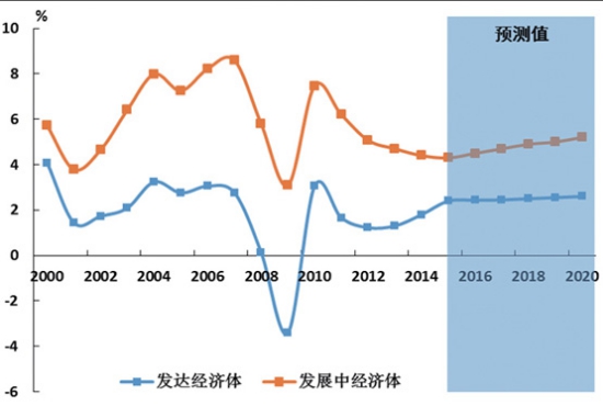 圖1 世界經(jīng)濟(jì)增速 發(fā)展中經(jīng)濟(jì)體地位繼續(xù)提升,經(jīng)濟(jì)增長(zhǎng)的引擎回歸發(fā)達(dá)經(jīng)濟(jì)體。2000-2007年發(fā)展中經(jīng)濟(jì)體年均增速為6.7%,高于世界平均增速2.3個(gè)百分點(diǎn)。受到金融危機(jī)沖擊,發(fā)達(dá)經(jīng)濟(jì)體出現(xiàn)大幅度的下滑(如圖2所示),歐美日經(jīng)濟(jì)同時(shí)面臨巨大沖擊甚至出現(xiàn)萎縮,發(fā)展中經(jīng)濟(jì)體雖然經(jīng)濟(jì)增速有所下降,但明顯好于發(fā)達(dá)經(jīng)濟(jì)體,發(fā)展中經(jīng)濟(jì)體特別是中國(guó)一度扮演了世界經(jīng)濟(jì)增長(zhǎng)引擎的角色。依托技術(shù)優(yōu)勢(shì),發(fā)達(dá)經(jīng)濟(jì)體增速呈現(xiàn)回升態(tài)勢(shì),而發(fā)展中經(jīng)濟(jì)體增速將有所放緩,與世界經(jīng)濟(jì)平均增速差異明顯縮小到1.1個(gè)百分點(diǎn)。預(yù)計(jì)“十三五”期發(fā)達(dá)經(jīng)濟(jì)體的年均增速為2.5%,發(fā)展中經(jīng)濟(jì)體為4.9%(如圖2所示)。按照對(duì)世界經(jīng)濟(jì)增長(zhǎng)的絕對(duì)凈貢獻(xiàn)來(lái)計(jì)算,經(jīng)濟(jì)增長(zhǎng)引擎開(kāi)始回歸到發(fā)達(dá)經(jīng)濟(jì)體,這意味著相對(duì)于集裝箱而言,大宗貨物海運(yùn)需求減緩將更加明顯。