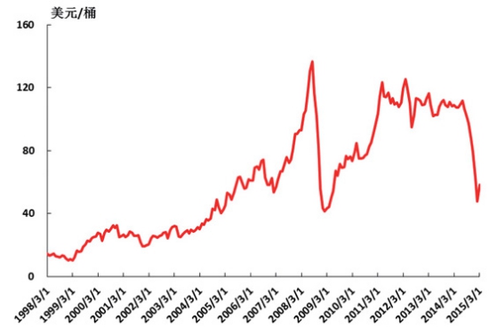 圖2 發(fā)達(dá)經(jīng)濟(jì)體與發(fā)展中經(jīng)濟(jì)體增速 2. 資源類(lèi)大宗商品供需關(guān)系轉(zhuǎn)換,商品價(jià)格相對(duì)低位。 大宗資源類(lèi)價(jià)格進(jìn)入一輪低谷。在上一輪世界經(jīng)濟(jì)快速增長(zhǎng)的帶動(dòng)下,對(duì)石油、鐵礦石等資源類(lèi)商品需求快速增長(zhǎng),天平向供給方傾斜,推動(dòng)了資源價(jià)格大幅度上漲(如圖3和圖4所示),同時(shí)也刺激資本對(duì)資源開(kāi)發(fā)、生產(chǎn)投入大幅度增長(zhǎng)。在世界經(jīng)濟(jì)增速放緩、生產(chǎn)率效率持續(xù)提高和日益注重節(jié)能減排的背景下,需求減弱,而產(chǎn)出穩(wěn)定增長(zhǎng),供需關(guān)系出現(xiàn)了失衡,天平向需求方傾斜,資源價(jià)格開(kāi)始大幅下跌。石油價(jià)格一度跌至40多美元,中國(guó)鐵礦石到岸價(jià)也跌至60-70美元的水平(如圖3和圖4所示)。從多個(gè)機(jī)構(gòu)的預(yù)測(cè)來(lái)看,今后一個(gè)時(shí)期大宗商品價(jià)格很難有大幅提升。