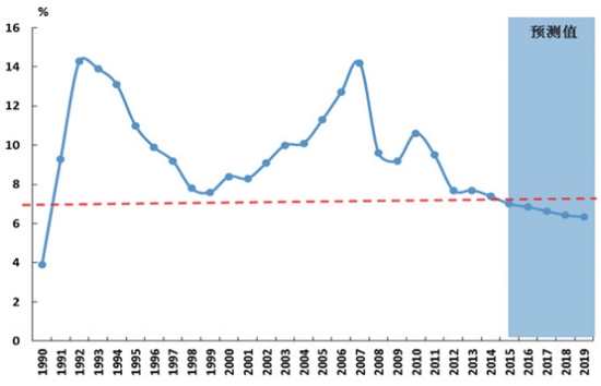 圖3 布倫特原油現(xiàn)貨價(jià)格 3. 技術(shù)孕育新突破,世界經(jīng)貿(mào)構(gòu)筑新格局。 自身發(fā)展規(guī)律和全球經(jīng)濟(jì)調(diào)整都揭示出未來(lái)將取得重大技術(shù)突破。從重大技術(shù)突破自身規(guī)律看,當(dāng)前正處于孕育期,盡管突破的核心技術(shù)難以預(yù)測(cè),但可以看到信息化、能源和人工智能以及以美國(guó)為代表的生物醫(yī)藥技術(shù),都可以作為孕育突破的溫床。身邊就可以看到的是互聯(lián)網(wǎng)正逐步改變著企業(yè)經(jīng)營(yíng)和人們的生活消費(fèi),突破了以往的商業(yè)模式。 技術(shù)經(jīng)濟(jì)對(duì)比變化和各國(guó)戰(zhàn)略調(diào)整,推動(dòng)形成新的經(jīng)貿(mào)格局。為有效應(yīng)對(duì)經(jīng)濟(jì)發(fā)展和全球氣候變化面臨的新問(wèn)題,發(fā)達(dá)國(guó)家依托技術(shù)優(yōu)勢(shì),促使經(jīng)濟(jì)逐步復(fù)蘇,并成為世界經(jīng)濟(jì)增長(zhǎng)的主要?jiǎng)恿ΑC绹?guó)重振制造業(yè)和德國(guó)工業(yè)4.0代表著西方國(guó)家的制造業(yè)開(kāi)始重新展現(xiàn)出新的活力,成為經(jīng)濟(jì)復(fù)蘇的重要?jiǎng)恿,同時(shí)以歐盟為代表的發(fā)達(dá)國(guó)家依托節(jié)能減排技術(shù)優(yōu)勢(shì),大力推動(dòng)低碳發(fā)展和碳交易,也在重塑世界制造業(yè)貿(mào)易格局,帶動(dòng)發(fā)達(dá)國(guó)家重回世界引擎地位。發(fā)展中實(shí)體之間經(jīng)濟(jì)增長(zhǎng)也開(kāi)始出現(xiàn)差異,金磚國(guó)家之間分化明顯,預(yù)計(jì)“十三五”期印度經(jīng)濟(jì)年均增速約為6.5%,而巴西、俄羅斯分別降為2.7%和1.8%。世界經(jīng)濟(jì)力量、技術(shù)力量對(duì)比的變化,加之地緣政治和各國(guó)戰(zhàn)略的調(diào)整,正在推動(dòng)全球形成新的經(jīng)貿(mào)格局,為適應(yīng)這種變化,美國(guó)通過(guò)主導(dǎo)的TPP、TTIP意在構(gòu)筑國(guó)際貿(mào)易的新規(guī)則 TPP,與此相對(duì)應(yīng),我國(guó)也通過(guò)全面推進(jìn)自由貿(mào)易區(qū)和“一帶一路”戰(zhàn)略,來(lái)適應(yīng)國(guó)際形勢(shì)變化,調(diào)整國(guó)家戰(zhàn)略。 “十三五”我國(guó)經(jīng)貿(mào)發(fā)展特點(diǎn) 1.我國(guó)經(jīng)濟(jì)轉(zhuǎn)向中速增長(zhǎng)階段,經(jīng)濟(jì)結(jié)構(gòu)發(fā)生轉(zhuǎn)折性變化。 經(jīng)濟(jì)進(jìn)入中速增長(zhǎng)階段。圖5顯示了1990年以來(lái)我國(guó)經(jīng)濟(jì)增速的變化。2000-2010年我國(guó)經(jīng)濟(jì)、對(duì)外貿(mào)易分別保持了年均10.5%和20.2%的增長(zhǎng),2010年后呈現(xiàn)逐步放緩態(tài)勢(shì),2014年降為7.4%。當(dāng)前,我國(guó)經(jīng)貿(mào)發(fā)展面臨十分復(fù)雜的國(guó)際環(huán)境,內(nèi)部則處于“三期”疊加期。隨著新型工業(yè)化、信息化、農(nóng)業(yè)現(xiàn)代化和城鎮(zhèn)化“新四化”的不斷推進(jìn),以及市場(chǎng)機(jī)遇、投資機(jī)遇、綠色機(jī)遇和對(duì)外合作機(jī)遇的不斷擴(kuò)大,為我國(guó)經(jīng)濟(jì)增長(zhǎng)提供了巨大潛力和回旋空間。這些發(fā)展環(huán)境變化使我國(guó)經(jīng)濟(jì)發(fā)展進(jìn)入新常態(tài),預(yù)計(jì)2015年GDP增長(zhǎng)約7%,“十三五”期間經(jīng)濟(jì)平均增速只要保持在6.6%(如圖5所示),即可實(shí)現(xiàn) 2020年GDP總量比2010年翻一番的戰(zhàn)略目標(biāo),按照人均GDP水平測(cè)算,我國(guó)將進(jìn)入高收入國(guó)家行列,對(duì)海運(yùn)需求質(zhì)量將全面提高。