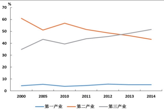 圖5 我國(guó)GDP增速變化 產(chǎn)業(yè)與區(qū)域經(jīng)濟(jì)結(jié)構(gòu)調(diào)整,第三產(chǎn)業(yè)成為經(jīng)濟(jì)增長(zhǎng)的主要?jiǎng)恿ΑkS著經(jīng)濟(jì)社會(huì)的進(jìn)步,經(jīng)濟(jì)結(jié)構(gòu)不斷優(yōu)化,第三產(chǎn)業(yè)所占比重逐步提高,并于2013年首次超過(guò)第二產(chǎn)業(yè)(如圖6所示)。未來(lái),經(jīng)濟(jì)將進(jìn)入中速增長(zhǎng)階段,而第三產(chǎn)業(yè)可望保持相對(duì)較快的增長(zhǎng),占GDP比重持續(xù)提高,結(jié)構(gòu)不斷優(yōu)化。從三駕馬車(chē)的貢獻(xiàn)來(lái)看,外貿(mào)和投資的作用逐漸減弱,經(jīng)濟(jì)增長(zhǎng)主要依托消費(fèi)的增長(zhǎng)。消費(fèi)的增長(zhǎng)并不能像第二產(chǎn)業(yè)那樣直接拉動(dòng)運(yùn)輸需求量的增長(zhǎng),這一態(tài)勢(shì)使得運(yùn)輸需求對(duì)GDP增速?gòu)椥詼p弱。 經(jīng)濟(jì)增速整體放緩與個(gè)別產(chǎn)業(yè)快速增長(zhǎng)并存。從產(chǎn)業(yè)發(fā)展角度來(lái)看,無(wú)論是從國(guó)家深化改革,還是實(shí)體經(jīng)濟(jì)發(fā)展,要素資本的作用正逐步減小,制度資本的作用開(kāi)始顯現(xiàn),創(chuàng)新發(fā)展開(kāi)始優(yōu)于要素的投入,表現(xiàn)為在我國(guó)經(jīng)濟(jì)增速整體放緩的背景下,各產(chǎn)業(yè)之間開(kāi)始呈現(xiàn)明顯分化,如電商業(yè)務(wù)、快遞業(yè)務(wù)等開(kāi)始出現(xiàn)爆發(fā)式的增長(zhǎng)。從企業(yè)效益看,近年來(lái),盡管我國(guó)企業(yè)整體的回報(bào)在下降,但是少數(shù)產(chǎn)業(yè)回報(bào)依然保持較高水平。