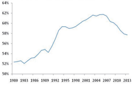 圖6 三大產(chǎn)業(yè)占規(guī)模經(jīng)濟(jì)比重變化 區(qū)域協(xié)調(diào)發(fā)展,沿海地區(qū)占經(jīng)濟(jì)比重下降。隨著西部開(kāi)發(fā)、中部崛起戰(zhàn)略的實(shí)施,中西部地區(qū)逐步扭轉(zhuǎn)了經(jīng)濟(jì)增速長(zhǎng)期低于沿海地區(qū)的態(tài)勢(shì),2004年后在經(jīng)濟(jì)總量中所占比重逐步上升。根據(jù)國(guó)家全面建成小康社會(huì)目標(biāo),在長(zhǎng)江經(jīng)濟(jì)帶、“一帶一路”和京津冀協(xié)同發(fā)展國(guó)家戰(zhàn)略的推動(dòng)下,東部沿海經(jīng)濟(jì)最發(fā)達(dá)地區(qū)將保持穩(wěn)定增長(zhǎng),但所占GDP比重呈現(xiàn)下降態(tài)勢(shì)(如圖7所示),各區(qū)域間的經(jīng)濟(jì)發(fā)展水平在趨于均衡。