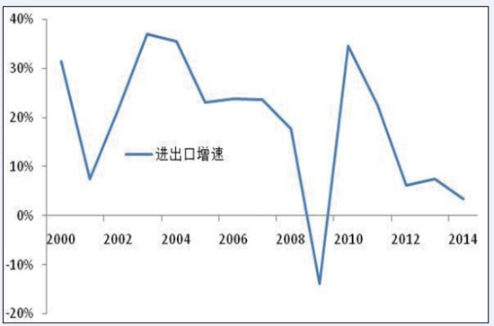 圖7 沿海地區(qū)(含北京)占全國(guó)GDP比重 2.對(duì)外貿(mào)易彈性下降,貿(mào)易伙伴多元化。 外貿(mào)保持穩(wěn)定增長(zhǎng),與經(jīng)濟(jì)彈性進(jìn)一步下降。在加入WTO的帶動(dòng)下,2000-2007年我國(guó)外貿(mào)進(jìn)出口總額保持了24.3%的年均增長(zhǎng)(如圖8所示),與 GDP的彈性系數(shù)高達(dá)2.25,明顯高出世界1.5的平均水平,成為世界重要經(jīng)貿(mào)大國(guó)。受到金融危機(jī)沖擊和全球貿(mào)易放緩的影響,面對(duì)國(guó)內(nèi)外復(fù)雜形勢(shì),2007-2014年我國(guó)對(duì)外貿(mào)易仍保持較快發(fā)展,外貿(mào)進(jìn)出口總額年均增速達(dá)到10.2%,國(guó)際貿(mào)易地位不斷提高,成為世界第一貨物貿(mào)易大國(guó)。隨著貿(mào)易依賴(lài)度的提高,進(jìn)出口彈性逐步下降,由2.25下降為1.16!笆濉逼陂g我國(guó)對(duì)外貿(mào)易發(fā)展將面臨更加復(fù)雜的國(guó)際環(huán)境,將逐步轉(zhuǎn)入平穩(wěn)發(fā)展階段,與 GDP的彈性下降為1.0,外貿(mào)進(jìn)出口總額增速保持在6.6%與GDP相當(dāng)?shù)乃健?BR> 貿(mào)易區(qū)域結(jié)構(gòu)不斷優(yōu)化,貿(mào)易伙伴保持多元化趨勢(shì)。隨著我國(guó)經(jīng)濟(jì)社會(huì)發(fā)展水平的提高,貿(mào)易呈現(xiàn)多元化發(fā)展趨勢(shì),特別是金融危機(jī)后,亞洲、歐洲和北美洲占貿(mào)易比重由2007年的89.6%逐步降為2014年的85.1%,美國(guó)、歐盟和日本所占比重由41.1%降為34.4%,而非洲、拉丁美洲所占貿(mào)易比重則由 8.1%上升為11.3%。隨著世界貿(mào)易格局的調(diào)整,以及我國(guó)“一帶一路”戰(zhàn)略的推進(jìn),對(duì)外貿(mào)易結(jié)構(gòu)將進(jìn)一步優(yōu)化,與東盟、非洲等海上絲綢之路沿線國(guó)家貿(mào)易比重進(jìn)一步上升。