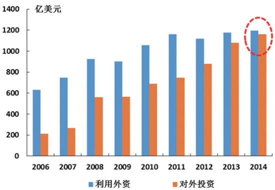 圖8 我國(guó)外貿(mào)進(jìn)出口總額增速變化 3.對(duì)外投資快速增長(zhǎng),“引進(jìn)來(lái)”與“走出去”并重。 我國(guó)將實(shí)現(xiàn)由利用外資為主逐步轉(zhuǎn)向利用外資與對(duì)外投資并重得格局轉(zhuǎn)換。改革開(kāi)放初期,由于經(jīng)濟(jì)社會(huì)發(fā)展水平較低,發(fā)展面臨資金短缺的壓力,形成了我國(guó)以引進(jìn)外資為主的格局。隨著我國(guó)經(jīng)濟(jì)發(fā)展、進(jìn)入中高收入國(guó)家行列和成為世界外匯儲(chǔ)備最多的國(guó)家,在繼續(xù)注重利用外資的同時(shí),也逐步擴(kuò)大對(duì)外投資,對(duì)外投資流量已居世界第三,吸引外資和對(duì)外投資都達(dá)到1000億美元規(guī)模,兩者基本均衡(如圖9所示)。從我國(guó)“走出去”的重點(diǎn)行業(yè)來(lái)看,主要集中于采礦業(yè)、制造業(yè)、服務(wù)業(yè)、高科技行業(yè)和優(yōu)勢(shì)農(nóng)業(yè)。預(yù)計(jì)“十三五”期間對(duì)外投資將保持1000億美元,“走出去”發(fā)展將使我國(guó)海運(yùn)需求由原來(lái)的放射結(jié)構(gòu),轉(zhuǎn)向全球網(wǎng)絡(luò)化結(jié)構(gòu);同時(shí)針對(duì)“走出去”面臨各種風(fēng)險(xiǎn),要求海運(yùn)在應(yīng)對(duì)突發(fā)事件中更好地發(fā)揮支持保障作用。