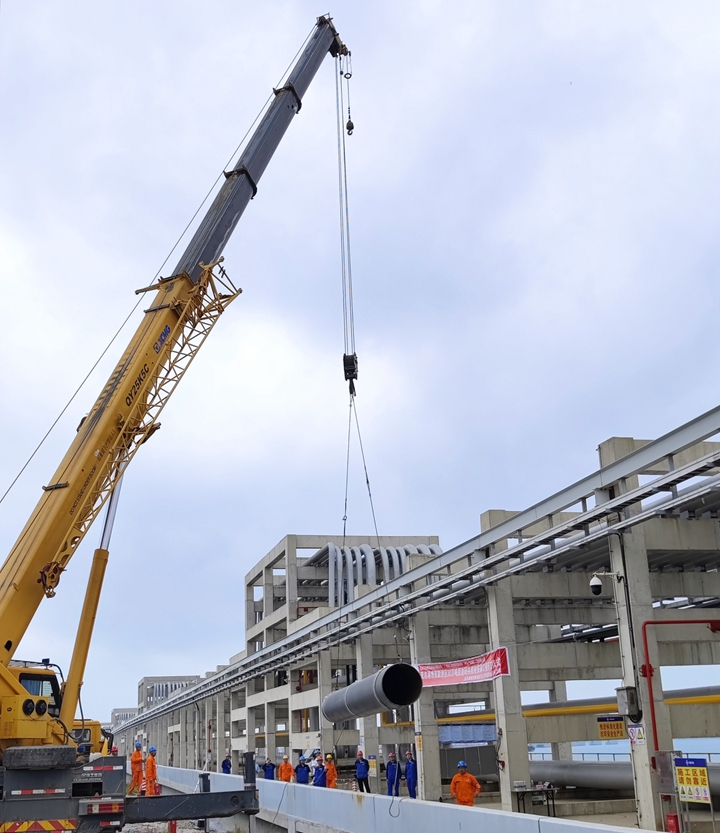 據(jù)悉,30萬噸級原油碼頭工程設(shè)置2根DN900的原油運(yùn)輸主管,起點(diǎn)為30萬噸級原油碼頭E1泊位,終點(diǎn)為東防波堤堤根的公用管廊終點(diǎn),原油管線總長度約為6km,此次施工吊裝的首根原油管道長約12.29米,重約3.46噸。公共管廊處管線多,作業(yè)空間狹隘,需要在保護(hù)已有管線設(shè)備的前提下進(jìn)行安全精準(zhǔn)化吊裝作業(yè),對此,臨時(shí)黨支部多次協(xié)調(diào)組織監(jiān)理單位、施工單位和運(yùn)營單位的專業(yè)人員提前規(guī)劃管道吊裝方案,協(xié)調(diào)組織各方專業(yè)人員現(xiàn)場值守,從而保障管道吊裝作業(yè)安全可控地順利開展。
