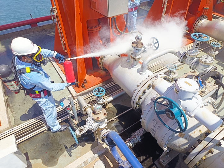 演練現(xiàn)場(chǎng),警報(bào)聲響起,人員、車輛迅速集結(jié)到位。按照搶險(xiǎn)救災(zāi)組、疏散警戒組、通訊聯(lián)絡(luò)組、后勤保障組、醫(yī)療救護(hù)組、后勤醫(yī)療組等五個(gè)工作組的分工要求,參演人員各就各位、各司其責(zé)。他們有的迅速疏散無(wú)關(guān)人員完成現(xiàn)場(chǎng)警戒;有的迅速向市公司指揮中心及相關(guān)部門報(bào)告情況;有的迅速使用消防水泵泡沫泵、干粉滅火器撲滅初期火災(zāi),并對(duì)泊位E2裝卸區(qū)進(jìn)行全面冷卻;有的迅速開展醫(yī)療及后勤等方面的應(yīng)急處理。各參演小組反應(yīng)快速、緊密配合、協(xié)同作戰(zhàn),現(xiàn)場(chǎng)警戒、人員疏散、滅火救援、后勤保障等各項(xiàng)應(yīng)急動(dòng)作有序進(jìn)行,處理流程和處理措施合理有效。