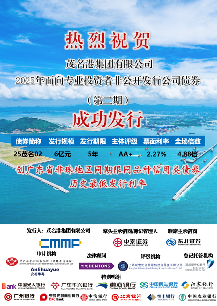 7月3日,茂名港集團(tuán)在資本市場再度傳來捷報,成功發(fā)行2025年度第二期私募公司債券,發(fā)行規(guī)模6億元。此次發(fā)行票面利率低至2.27%,創(chuàng)歷史新低,不僅進(jìn)一步優(yōu)化了集團(tuán)融資結(jié)構(gòu),更為港口業(yè)務(wù)發(fā)展注入強勁動能,彰顯出資本市場對其發(fā)展前景的高度認(rèn)可。